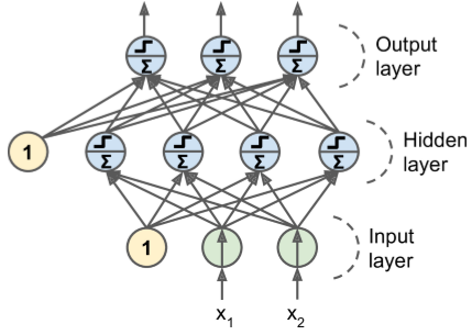 Every layer except the output layer includes a bias neuron and is fully connected to the next layer.