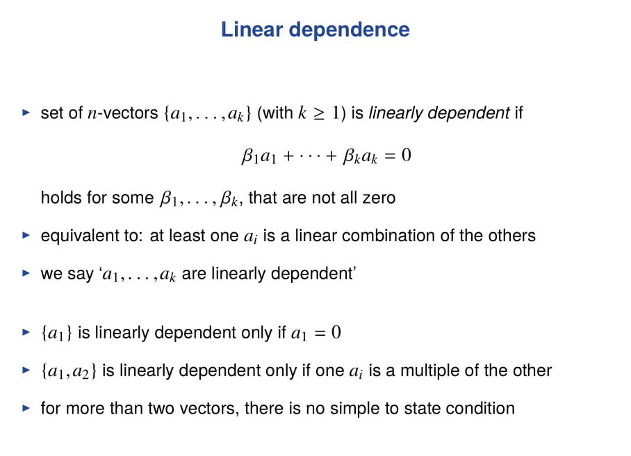 \begin{align} V &= Span(S) \\ &= \{\alpha_1 \mathbf v_1 + \alpha_2 \mathbf v_2 + ... + \alpha_n \mathbf v_n \text{ for all } \alpha_1,\alpha_2,...,\alpha_n \in \mathbf R\} \end{align}If the vectors in $S$ are linearly independent, they form a basis for $V$.